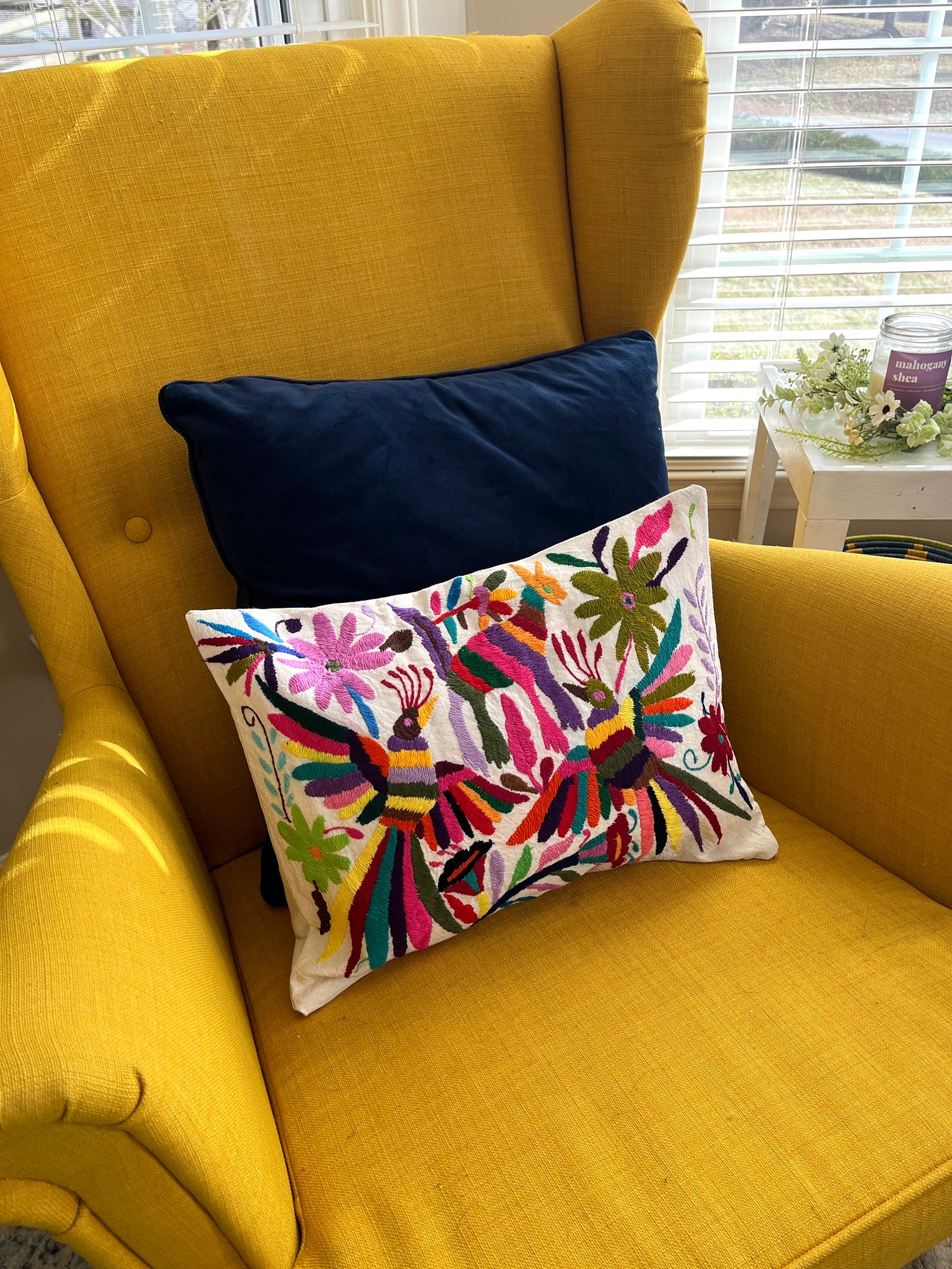 Otomí embroidery features hand drawn and hand embroidered art passed down through generations.
